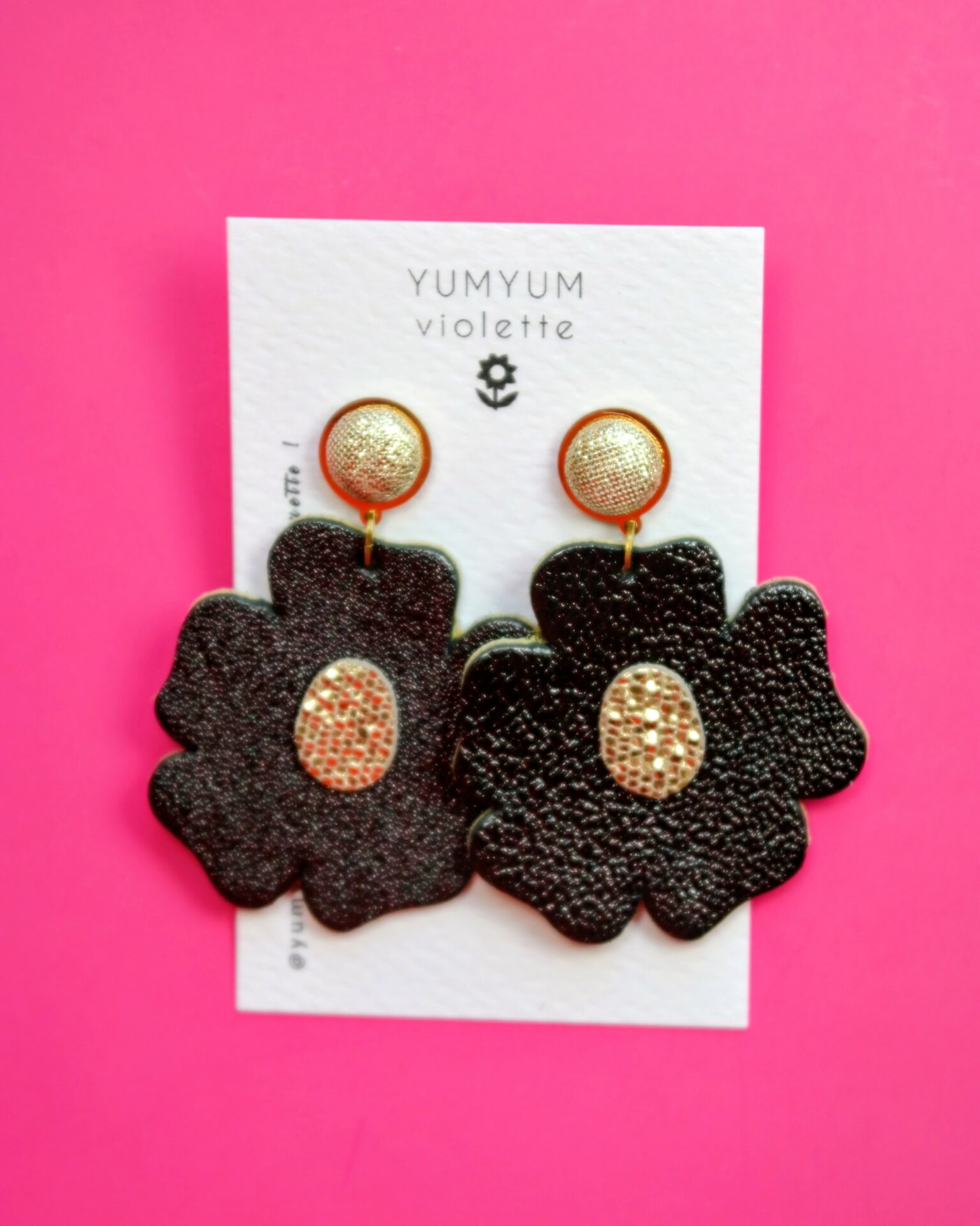 Modèle de boucles d’oreilles composé d’un petit bouton en tissu, de pièces en acier inoxydable et d’une grande fleur en cuir.