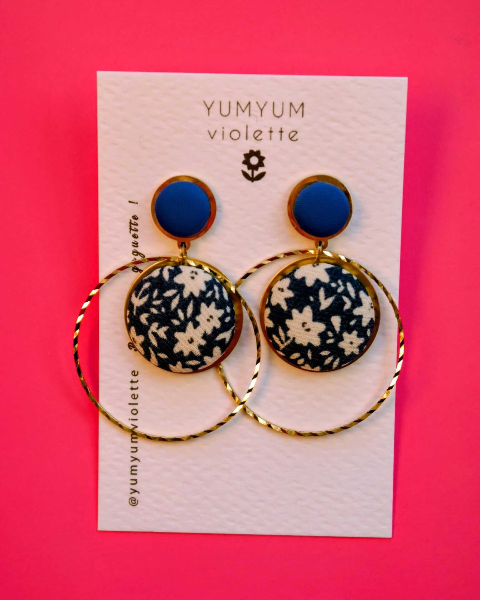 Modèle de boucles d’oreilles composé de boutons en tissus fixés sur des pièces en laiton et d’une jolie créole dorée. Clou d’oreilles en acier inoxydable doré.