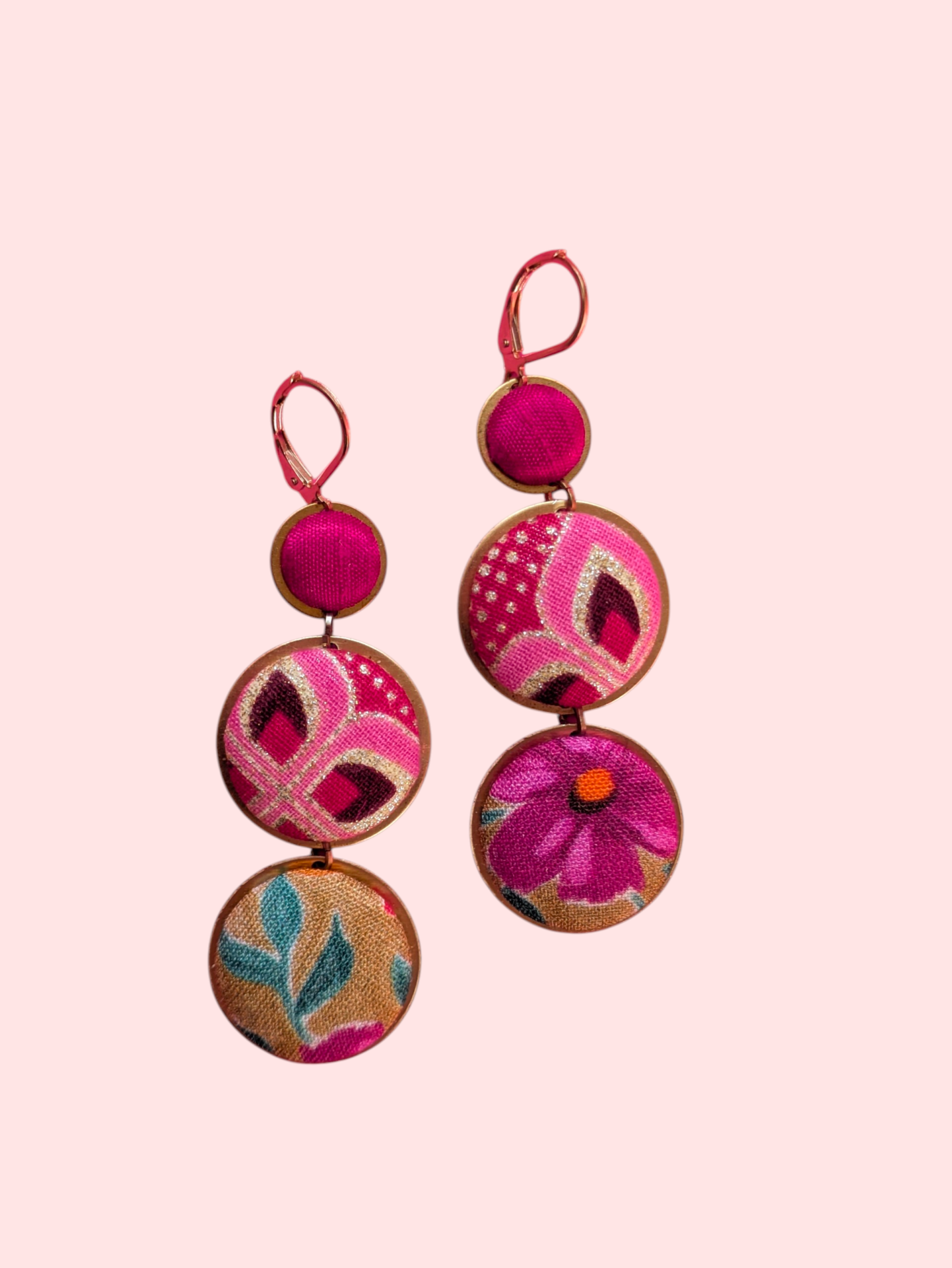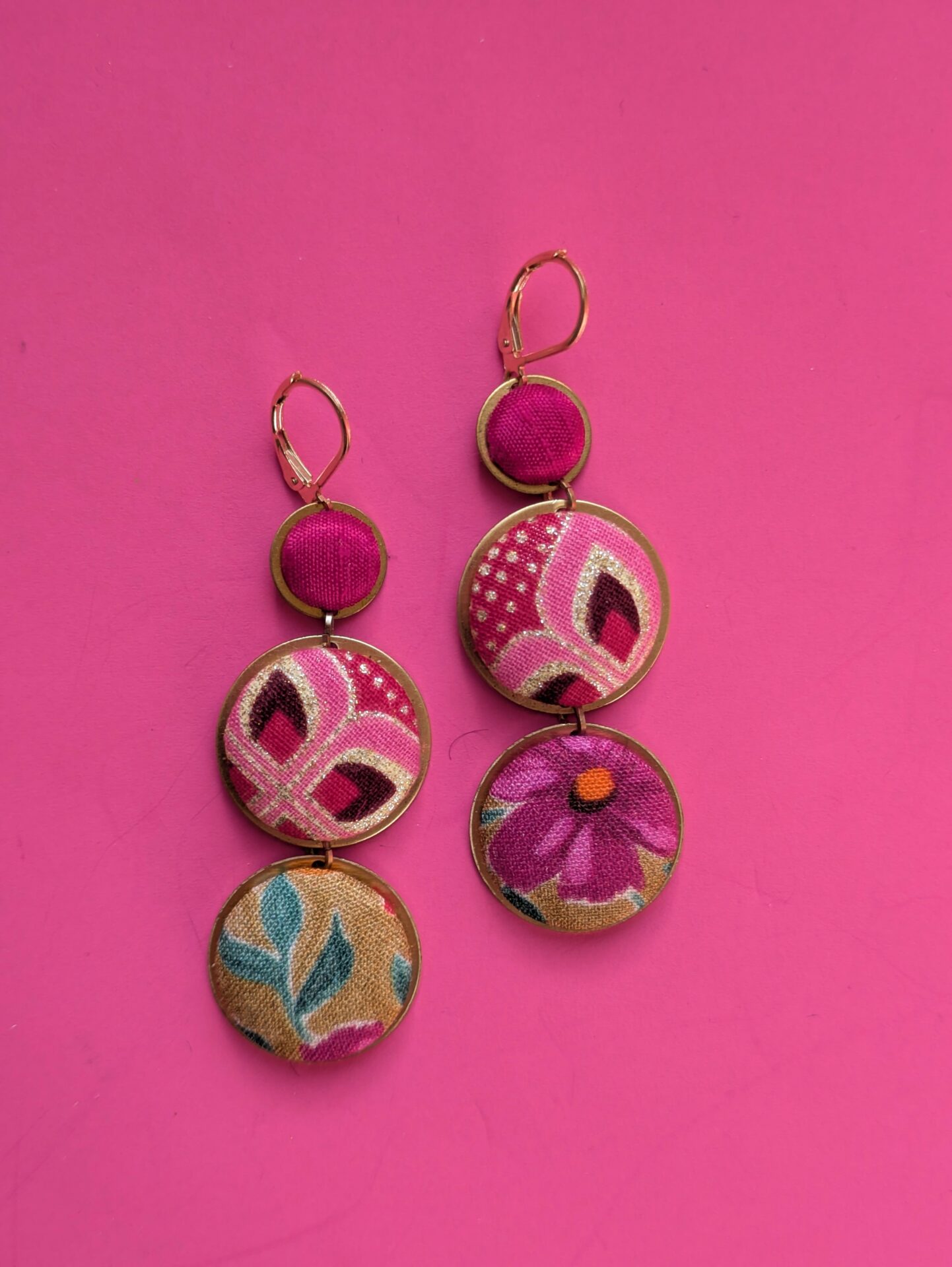 Modèle de boucles d’oreilles composé de 3 boutons en tissus, de pièces en laiton et de crochets dormeuses en acier inoxydable.